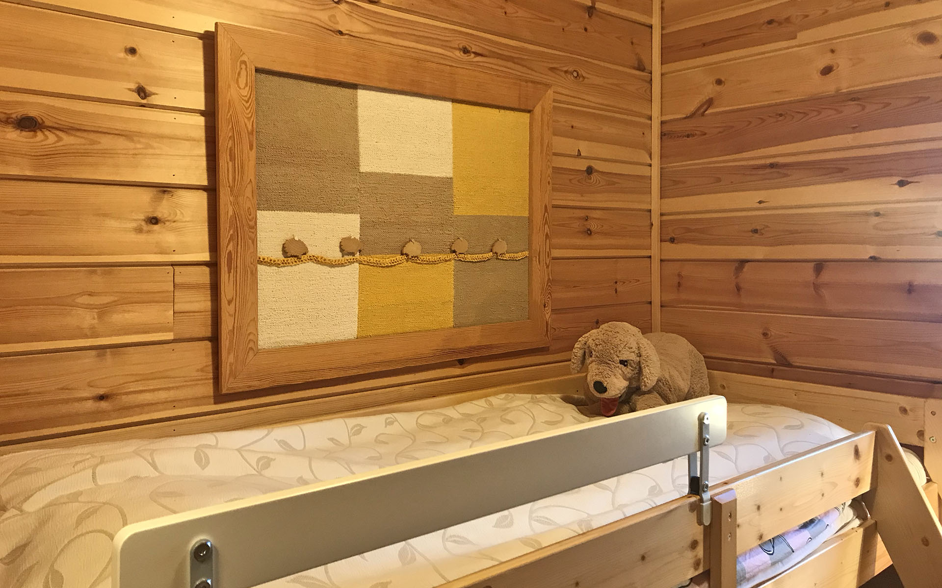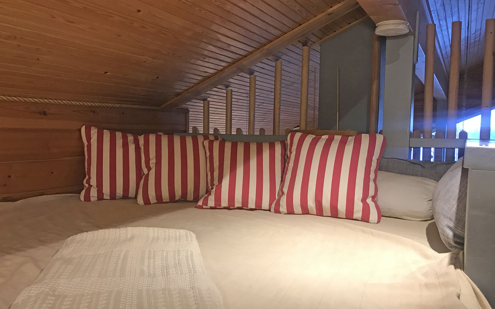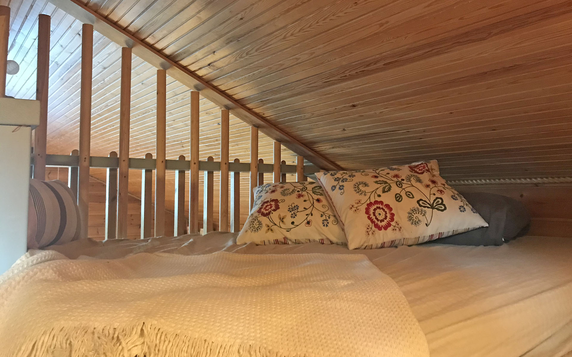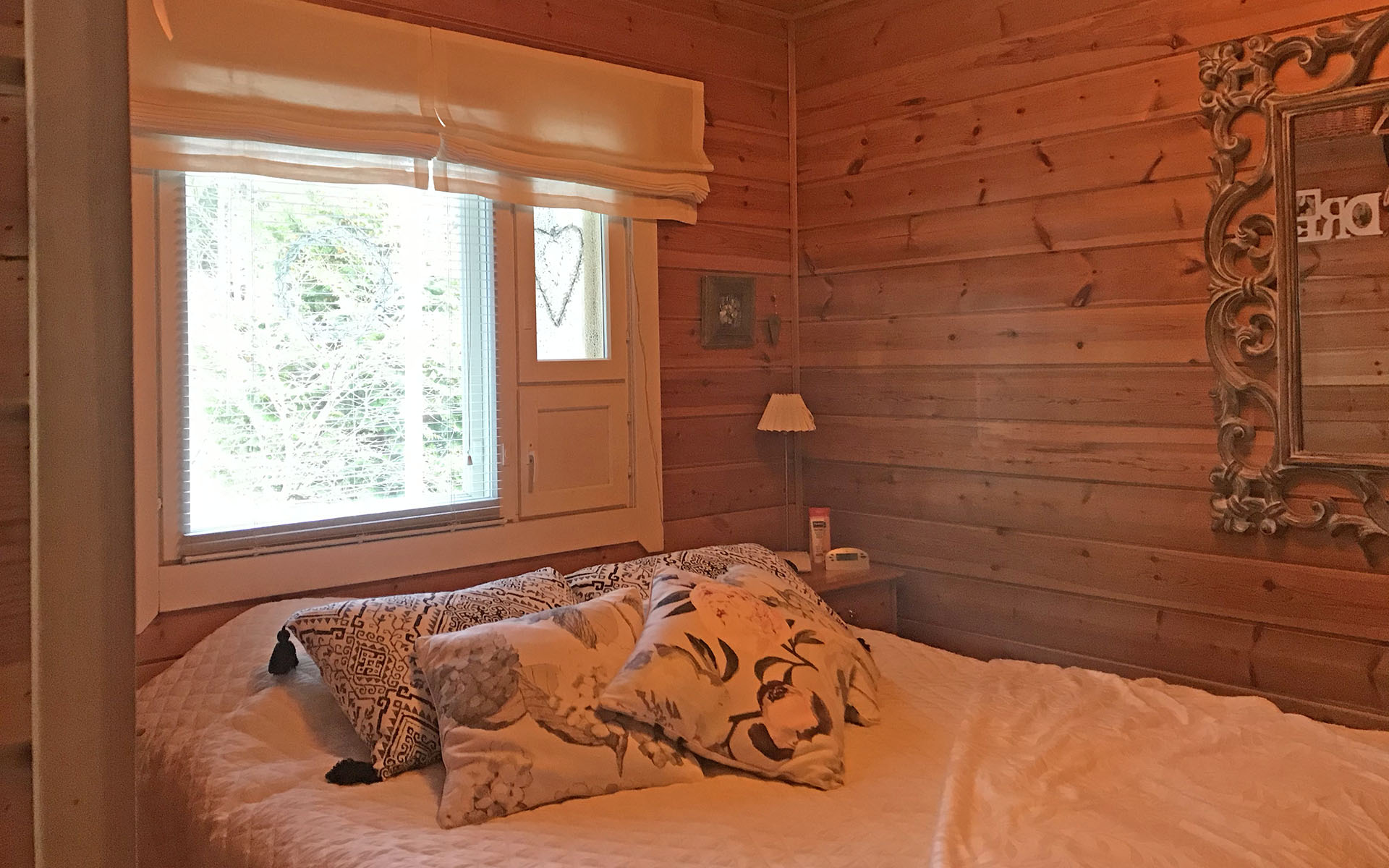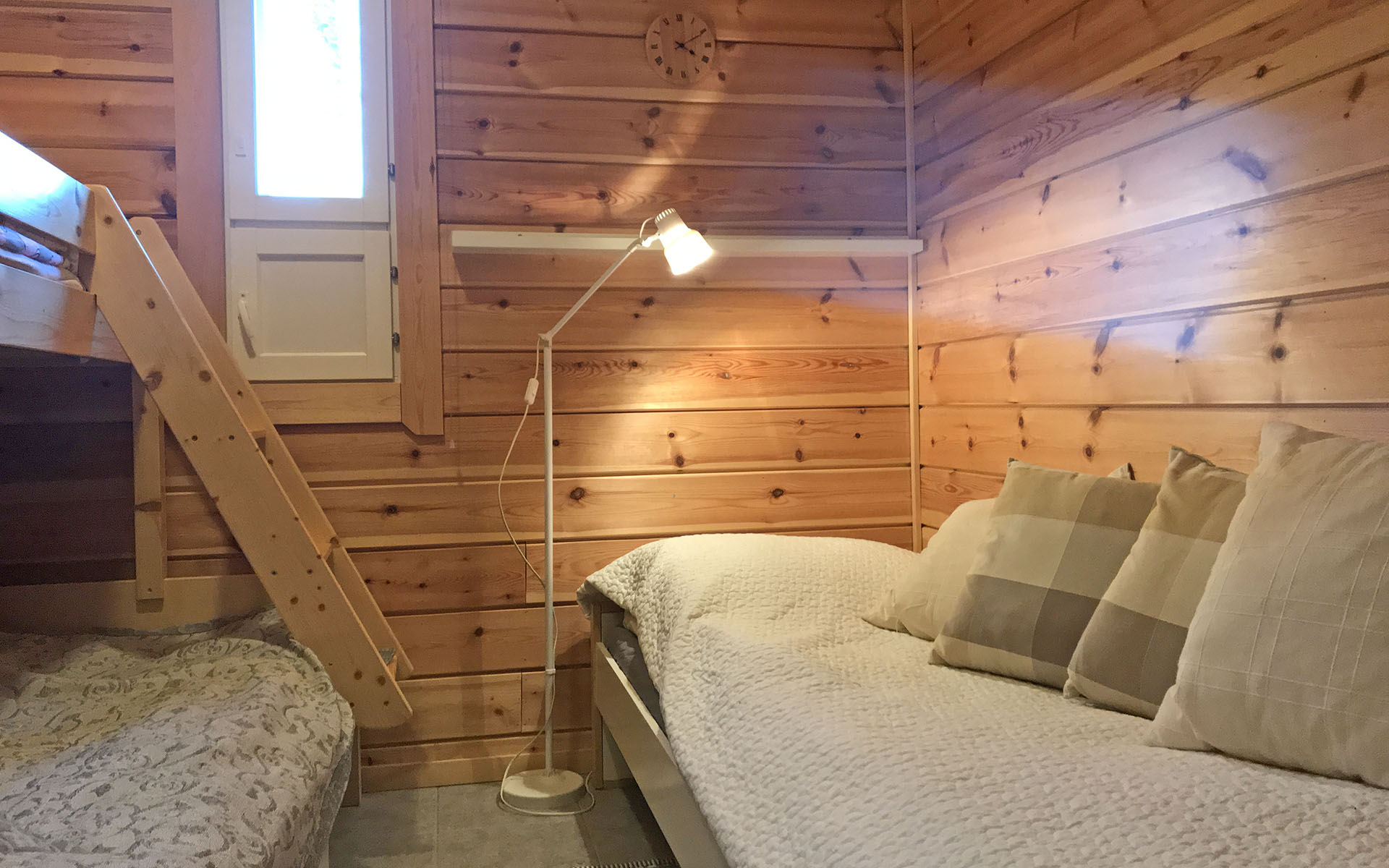 Mitä mökkiin sisältyy? Iso tupa-keittiö, yksi (1) makuuhuone (parisänky), parvi (2 x 160cm leveät patjat) + ns. välitila, kph, wc ja sauna (sähkökiuas). Erillisellä sisäänkäynnillä lasitetulta lukolliselta etuterassilta pääsy ns. aittahuoneeseen, jossa kerrossänky (yläsänky lev. 80cm, alasänky lev.120cm) ja tavallinen 80cm x 190 cm lisäsänky.
