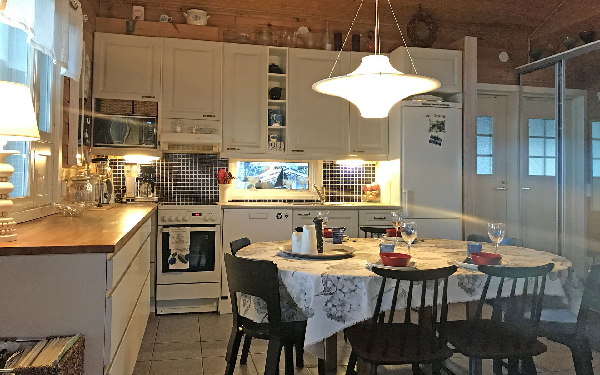 • Keittiössä mm. mikro, liesi/kiertoilmauuni, kahvinkeitin, vedenkeitin, leivänpaahdin, jääkaappipakastin, apk 60cm, iso astiasto